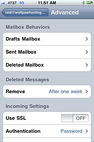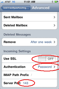 the incoming server make sure 'Use SSL' is OFF, 'Authentication'