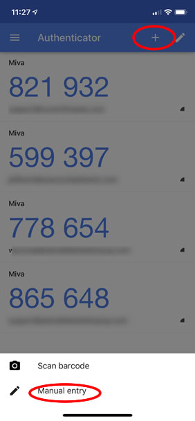 Open the Google app, click on the '+' plus to add a new user. Select manual entry and enter the 16 character key/code that you saved from the Miva two-factor setup screen above. You can scan the QR code with your smartphone's camera but be sure to copy the 16 character code for backup.