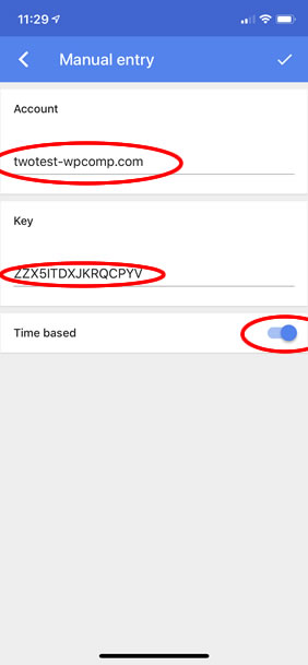 19. Enter the 16 character key/code from the Miva screen and an account name for the entry. Use the username and website name. Select 'Time based' as the type of password. Here we're setting up the user 'twotest' on the Google smartphone app. Because we're using twotest's 16 character code/key the Google app will generate the same one-time passwords.