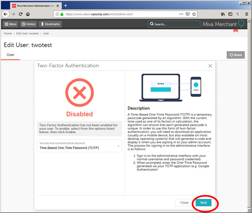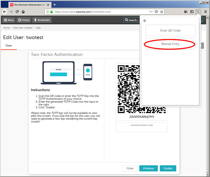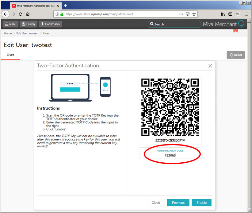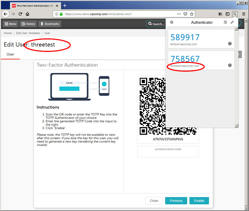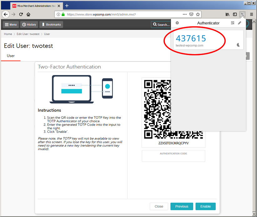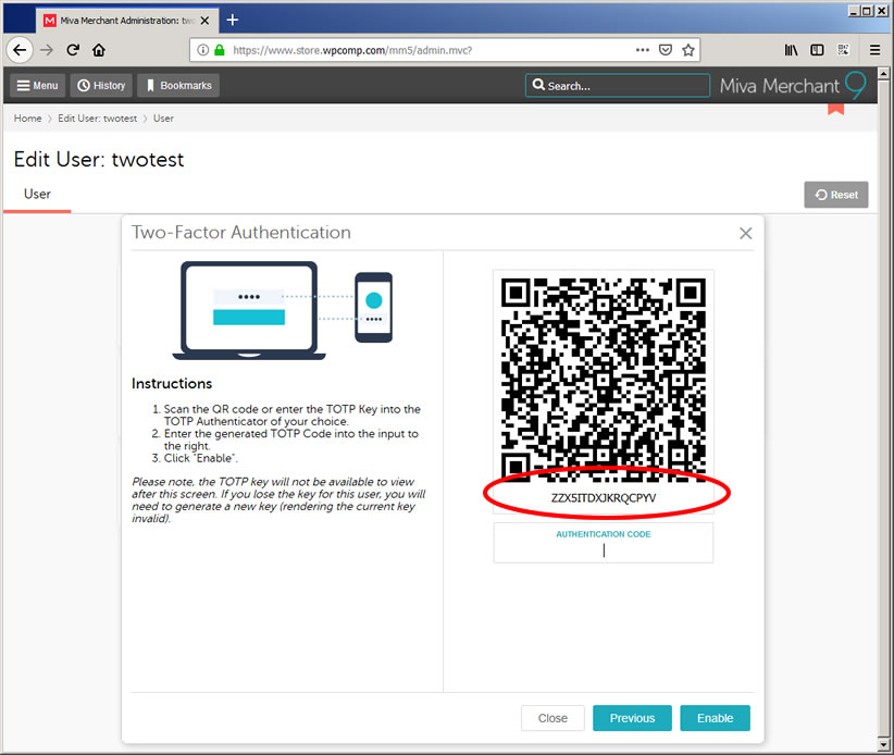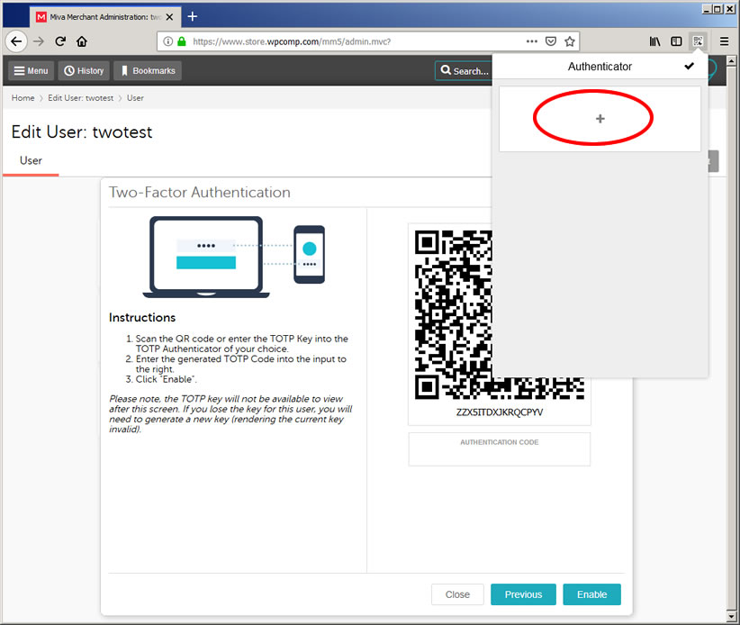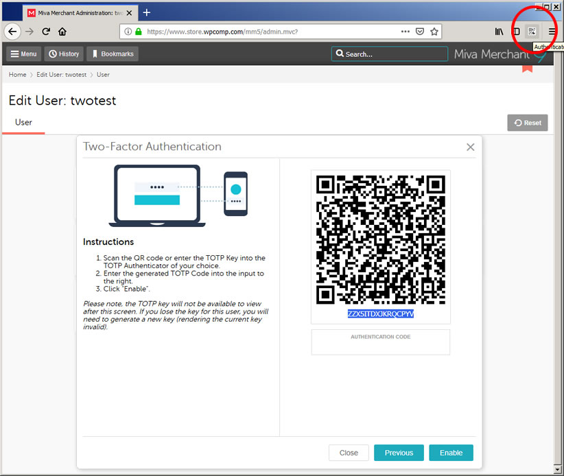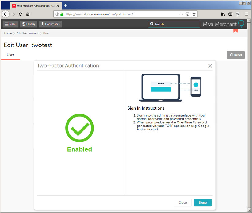 With Miva Merchant version 9.12 all admin users are required to use two-factor authentication when logging in. Two-factor authentication means that a second password or code obtained from a trusted source is needed when logging into the store. In this tutorial we show you how to setup two-factor authentication using a Time Based One-Time Password (TOTP) from Google's smartphone authentication app for IOS and Android and a similar browser plugin for Firefox and Chrome.