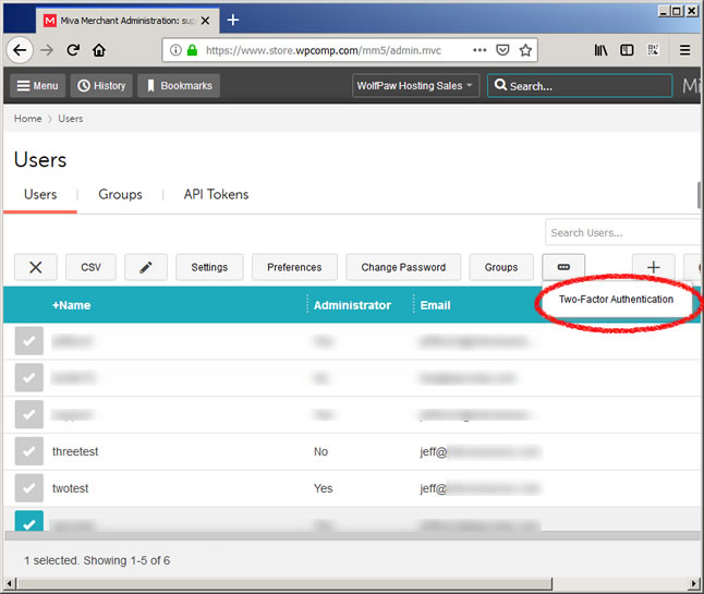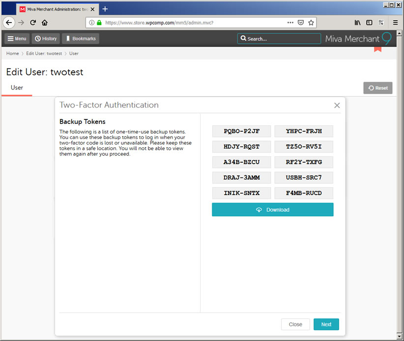 11. Copy the ten backup access tokens and store them in a safe place. If all else fails your can use these tokens to log into the Miva Admin. The users 'twotest' and 'threetest' have been deleted from the Wolfpaw store so don't bother testing these backup access tokens on our website.