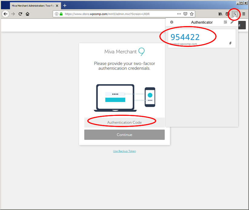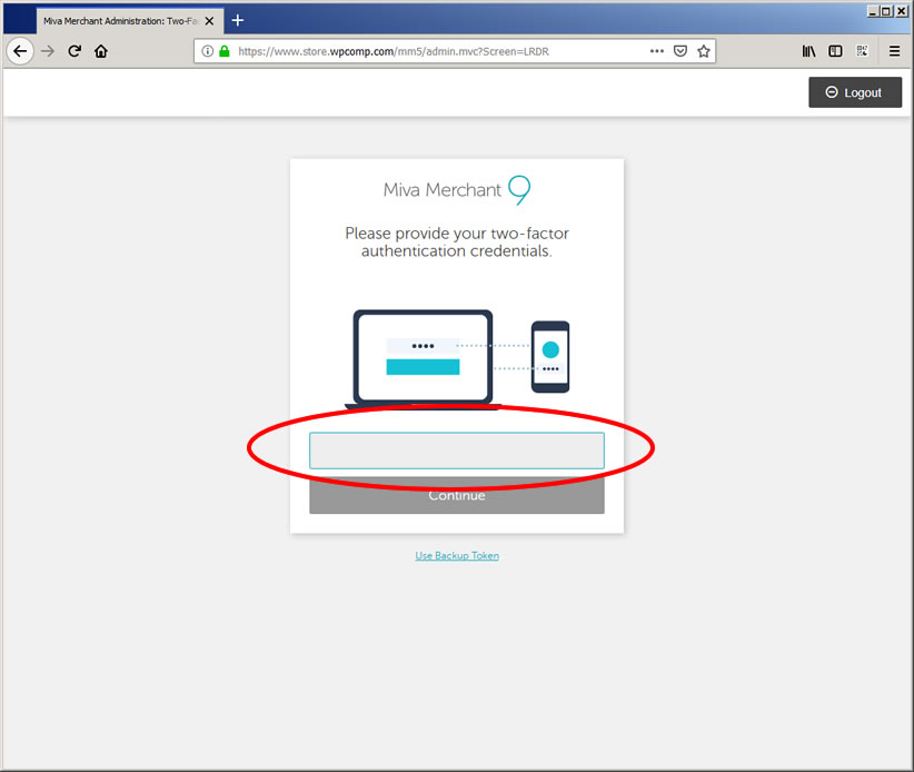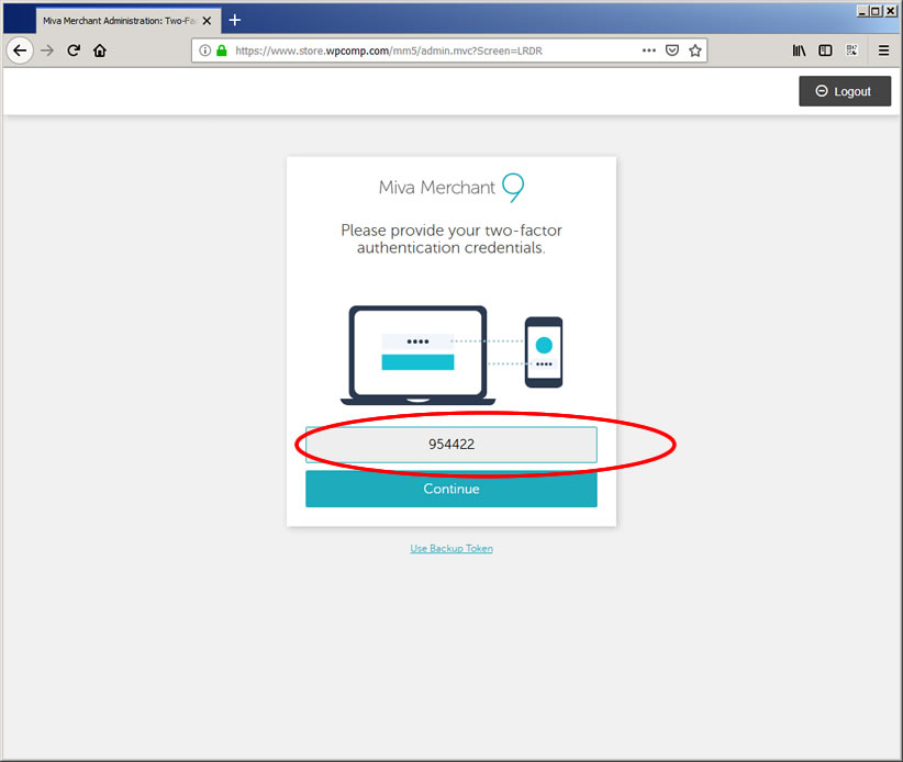16. Enter this six digit code in the Miva login screen and continue with the Miva login