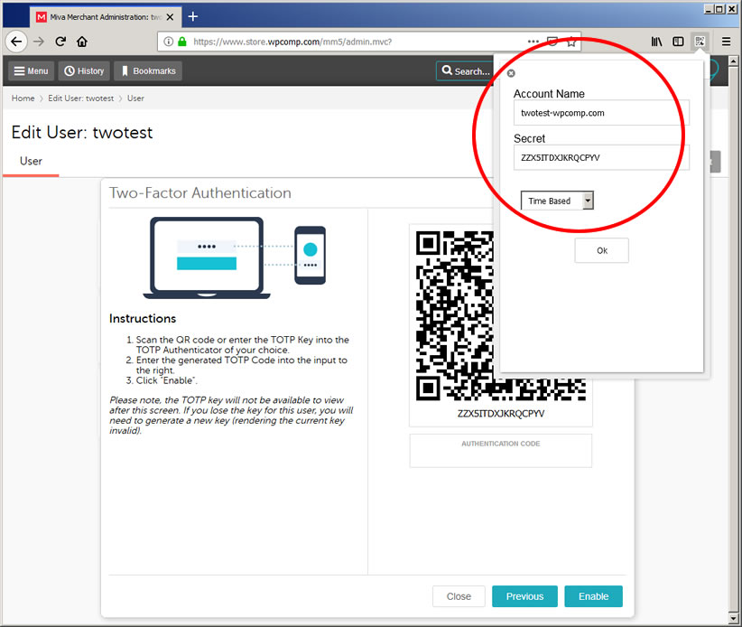 8. We're setting up authentication for the user 'twotest' on the wpcomp.com Miva store so let's enter an appropriate account name for this user. We'll use twotest-wpcomp.com. Then we'll paste this user's 16 character code/key in the box labelled 'Secret', select 'Time Based' from the drop down menu and click on OK. Note that we may have additional Miva users that need two-factor authentication. Each will have his own 16 character key/code and a separate entry on the authenticator plugin so it's important to have distinct account names.